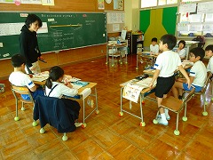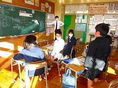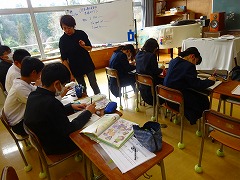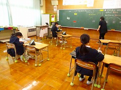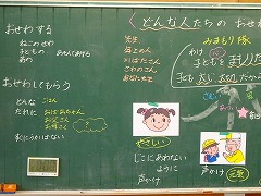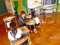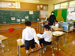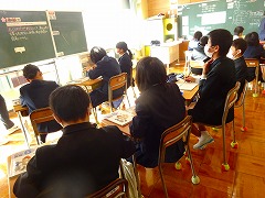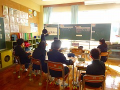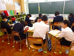 ↑ 5年・6年の家庭科の学習です。5年生は買い物について話し合いました。目的に合った買い物とはどのようなものか、具体例を出して話し合っています。6年生は家族に喜んでもらえる献立です。材料選びも調理の一つで、地産地消も意識して考えました。