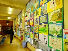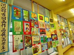 ↑ 河北郡市の高学年の力作が展示されています。絵を描いた児童の思いを想像しながら鑑賞させていただきました。