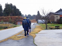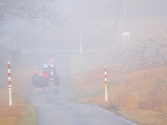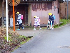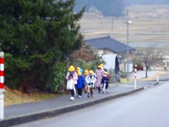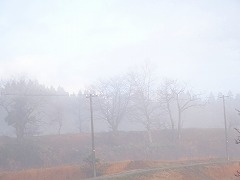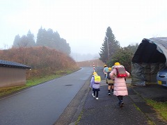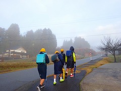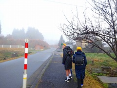 ↓ 朝霧の中、子供たちは登校してきました。うっすらとした中から、徐々に近づいてきます。