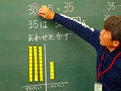 ↑ 1年算数 30+5、35-5等の計算の仕方をブロックを使って考えました。ブロックで動かし、説明すると、計算の仕組みがはっきり理解できました。