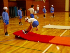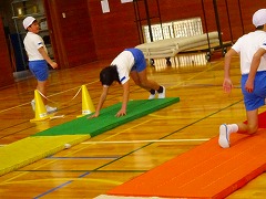 ↑ 5.6年生 マット運動 自分ができるようになりたい技が、できるようになるために場を選び、練習に励んでいます。