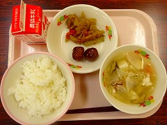 ↑ 今日の給食です。肉団子と、ヤーコンのきんぴらがありました。ヤーコンはキク科の根菜で、南米のアンデスが原産だそうです。シャキシャキした食感で、オリゴ糖やポリフェノール、食物繊維、ミネラルを豊富に含んでいて、最近注目されています。家でも料理に使ってみたくなりました。