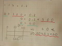 ↓5年算数 割合の学習です。数直線を描くと、内容をはっきり理解できます。