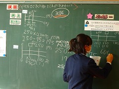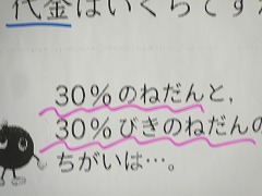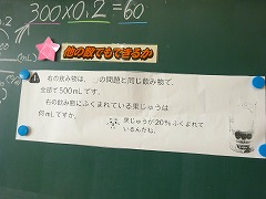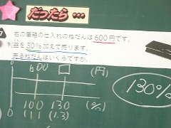 ↑ 5年算数 割合の学習です。今日は、30%引きの値段と、30%の値段と、さらには、30%増えた値段を比較して考えました。図に描いて、しっかり考えて、説明し、理解を深めていました。