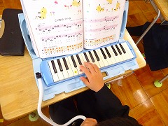 ↓1年音楽「みどみどみそそ ふぁれれ みどど・・・」指番号を確かめながら、鍵盤ハーモニカの練習をしました。