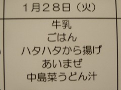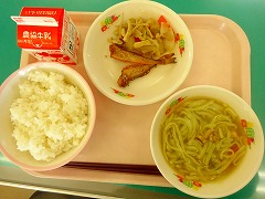 ↑全国学校給食週間が始まっています。今日は石川県の献立で、中島菜の入った緑色のうどんでした。中島菜のいろいろな食べ方があるので驚きました。