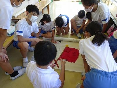 本日3限目に運動場で応援合戦のリハーサルと笠野っ子音頭の練習を行いました。応援合戦は、最初の頃に比べてかなり声も出るようになり、動きもだいぶ大きくなりました。本番はさらに熱が入るので、もっと迫力ある応援になると感じました。笠野っ子音頭も前回に比べてどの学年も上手に踊れていたと思います。保護者の方々と一緒に踊るのが楽しみです。そして、昼休みには、スローガンを描いた布に両軍の児童の名前をそれぞれが書き込み、完成していました。いよいよ運動会だなという雰囲気が盛り上がってきました。