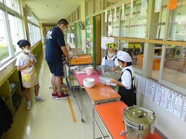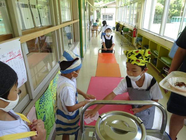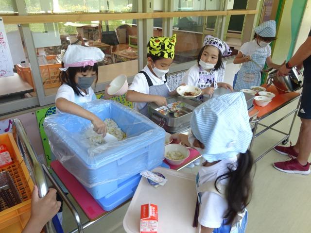 1年生は、今週から自分たちで給食の配膳をするようになりました。エプロンもばっちり似合っています。ワゴンを運んだり、配膳台を拭いたり、おかずをよそったりと、みんなで協力しながらがんばっています。自分たちで準備をした給食は、よりいっそうおいしく感じるかもしれませんね。