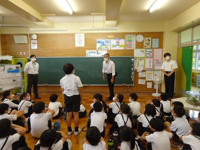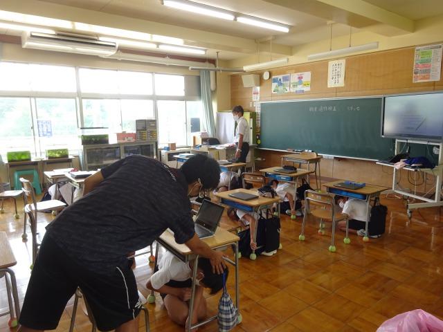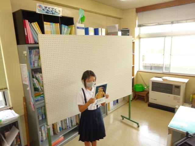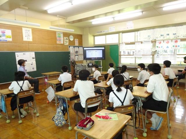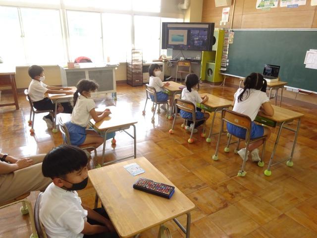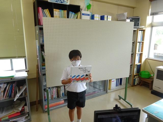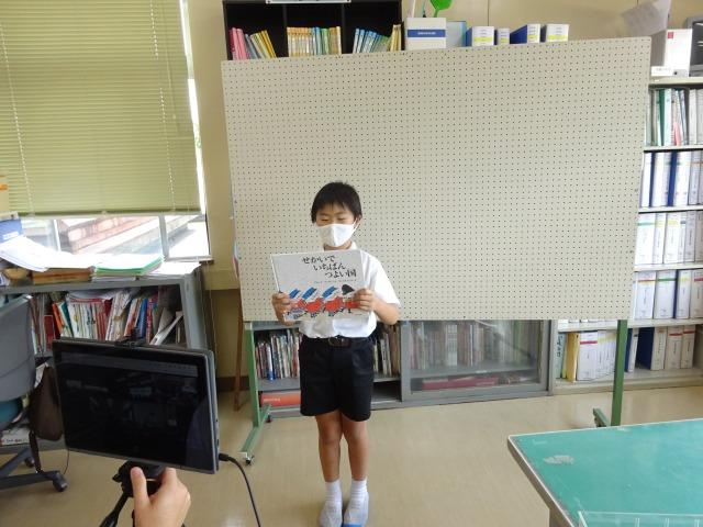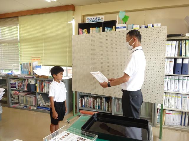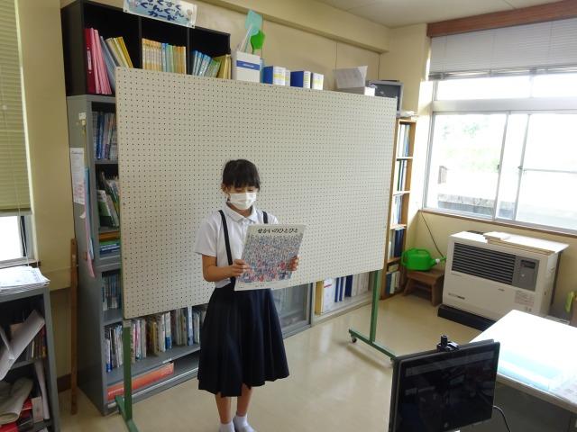今月の全校朝会に引き続いて、今回もオンラインでの終業式としました。最初は、今月の生活目標の取組「安全歩行レース」の表彰です。校長先生の話、夏休みの生活についての話と続き、最後は、4年生に、平和についての本を読んでの感想を発表してもらいました。平和への願いが伝わる感想を聞くことができました。世界中に平和が訪れることを願います。