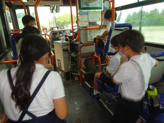 最初に町営バスに関わるクイズがあり、次に乗車から降車までの流れを練習しました。そしていよいよ発車です。コースは、学校から池ケ原の往復です。池ケ原では一度降車をして、バス停についての説明などもしていただきました。初めての児童にとっても楽しい体験になったようです。また乗る機会があるといいですね。