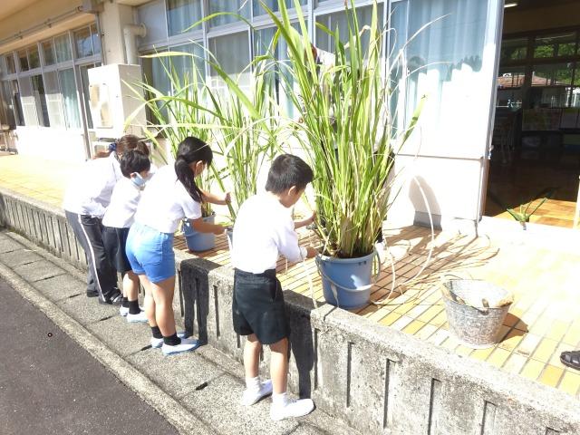 今日は、まこも生産組合の森山さんをお招きして、3年生が津幡町の特産品である「まこも」の学習をしました。3年生は、先日、田屋地区にあるまこもの畑を実際に見てきました。高いものになると3mほどにも達し、根元のほうに身をつけます。森山さんが収穫したまこもを持ってきて見せてくれました。今が収穫の時期で、てんぷらやサラダ、炒め物など様々な食べ方ができるそうです。学校のバケツで育てたまこもにも実がついていました。全国的にはあまり馴染みのない野菜かもしれませんが、津幡町民として特産品である「まこも」の学習ができてよかったです。