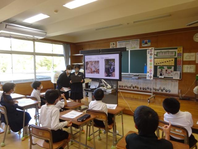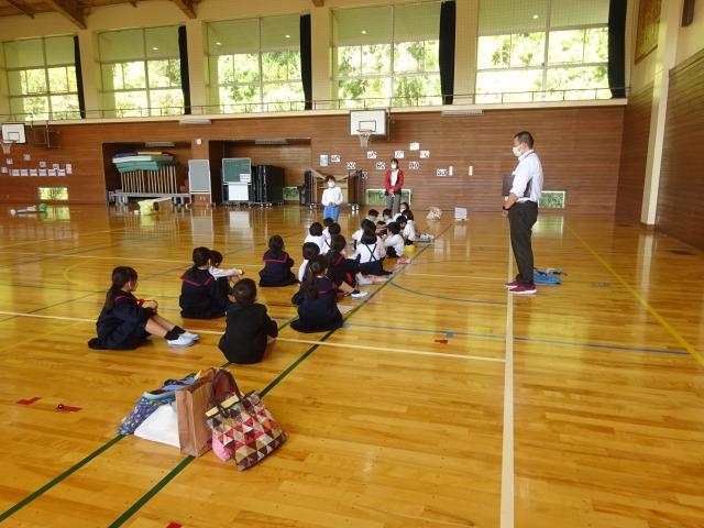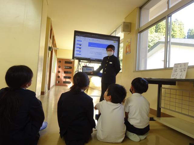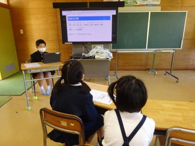 間近に迫った1~4年生のバス遠足のために、4年生が下級生に向けて日程や動物園についての説明をしました。自分たちで作成したプレゼンデータを使っての説明です。1~3年生はわくわくしながら聞いている様子でした。