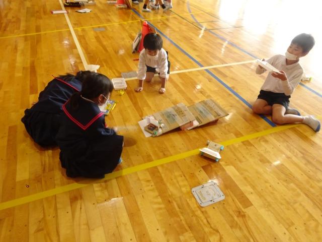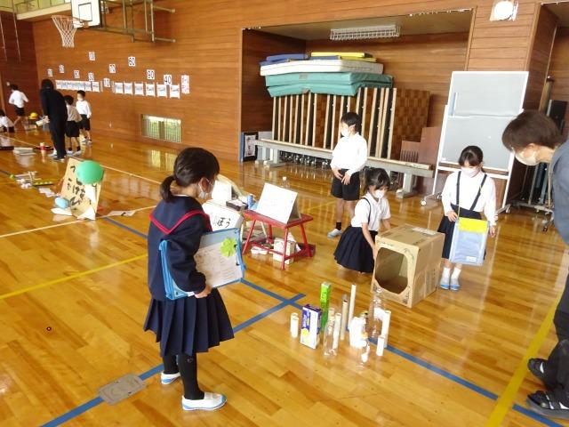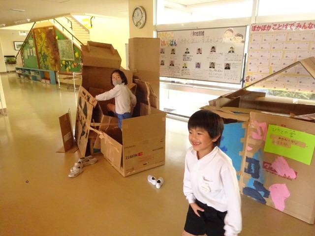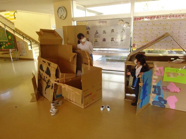 4年生が図工の時間に作った段ボールハウスを玄関ホールに展示しました。こわさないようにさわってもよいことにすると、1年生は興味津々でさっそく中に入り始めました。1年生も4年生もとても嬉しそうでした。