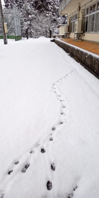 三寒四温とはよく言ったもので、暖かい陽気でグランドの積雪がなくなったかと思っていたら、バレンタイン寒波でまた15cmを超える積雪がありました。この冷え込んだ夜中に校地内への侵入者があったようで・・・。狸の類でしょうか。明日からはまた気温が上がるようです。