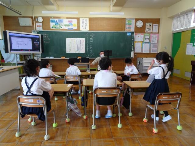 本校の1年生が輪島市立門前西小学校の1年生5名とオンラインで交流しました。国語科で作ったクイズをお互いに出し合う授業です。同じクラスのお友だちではない他校の児童に出題することで、モチベーションが上がりよい刺激にもなります。子どもたちは、きりっとした態度とわかりやすい話し方で出題することを心がけていたようです。