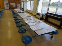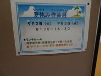 夏休みにがんばってつくった作品 「貯金箱」や「絵」、「習字」、「科学研究」、「読書感想文」など展示でれています。明日まで展示しています。