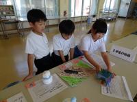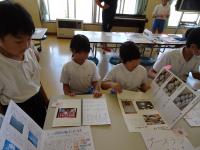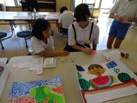 夏休み作品を子供たちが見に行って、すてきなところを見つけてメッセージを書いていました。すてきなところを言い合いながら仲良く見ています。新しい発見もあるようです。