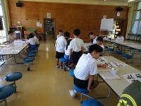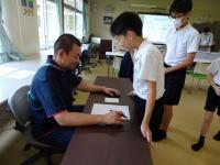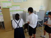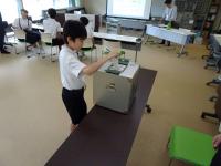 津幡町選挙管理委員会の方とクイズを解きながら「選挙の仕組み」を学習しました。投票所に1番に来た人だけが不正がないか投票する前に投票箱の中を見ることができることに驚いていました。津幡町長を選ぶ模擬投票しました。そして、実際に使われている投票台を使って投票用紙に記入し、投票箱に投票しました。投票の結果、モーちゃん町長が選ばれました。