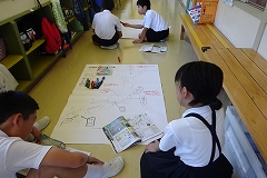 ↓5年社会 食糧ごとに分類し産地を調べ,白地図に記入していくと,特徴が見えてきました.気候や土地,人口などとの関係をそれぞれのグループで話し合いました.