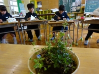 ↓ 机の上には,昨日の学習の「春のうた」にでてきた「(オオ)イヌノフグリ」が飾られていました.冬の冬眠から目覚めた蛙の情景への想像力が高まります.