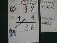 ↓2年生 算数 キーワードを見つけてまとめを自分たちで考えています.2桁と1桁のひっ算では,「1桁の数字は十の位を空ける」ことに目を付けていました.大切なことですね.位をそろえる学習とつながりました.