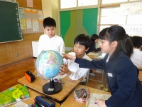 ↓5年 社会 地球儀で赤道,北緯,南緯,東経,西経等,基本となる地図用語を確認しました.