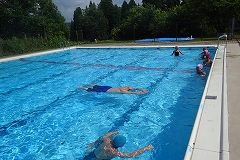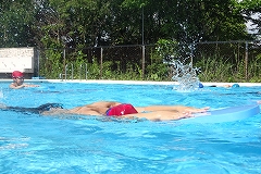 ↓3.4年生 プールで息継ぎ練習 最後に測った距離の測定では前回より伸びました.目標の距離を目指して,泳ぎの練習を続けています.まずは先生が蹴伸びのお手本を見せました.いつまでもどこまでも長く続きそうなくらい豪快な蹴伸びでした.
