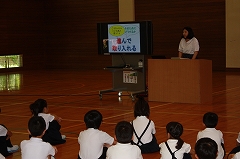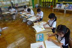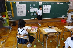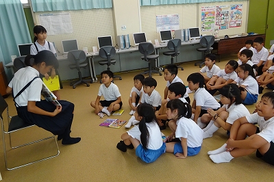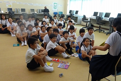 職員が研修を行っている間,児童は全員パソコン室に集合し,図書委員の児童に本の読み聞かせをしてもらいました.どの子も絵本の世界に引き込まれ、楽しそうに聞き入っていました。児童にとっても,職員にとっても有意義な時間でした.
