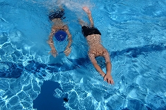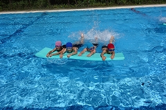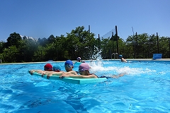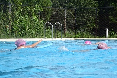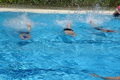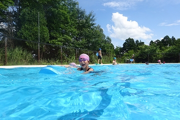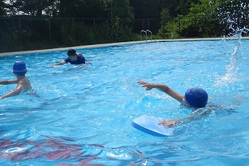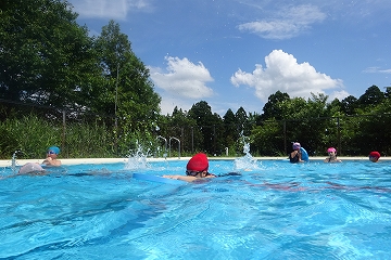 ↓ 久しぶりの真夏日です.やっとプールに入れました.3,4年生はビート板を持って息継ぎの練習を開始しました.25M泳ぎきるには,何としても息継ぎをマスターしなければなりません