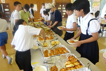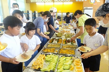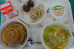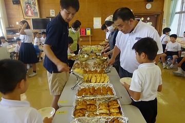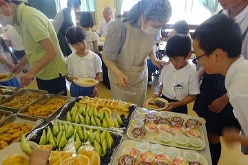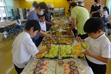 ↑豪華なメニューと種類の豊富さに驚きです.ここは笠野小ランチルームですが,笠野ホテルともおもわれるくらいのメニューです.パンは,メロンパン,クロワッサン,レモンパン,アンパンに焼きそばパン,パンを4つもお替りした子もいて心も満足,おなかも満腹です.果物は.グレープフルーツ,メロン,ブドウ,デザートは,青りんご,リンゴのババロア,チョコプリンにお米のプリン,メインディッシュは,ハンバーグ,魚のフライ,とんかつ,それから手作りのフライドポテト,花野菜サラダ,ミニトマト選ぶのが楽しかったです.お替りで,たくさんの種類をいただくことが出来ました.こんなにたくさん朝から作るのは大変だったでしょう.子供たちの笑顔のために調理員さんありがとうございました.選ぶということはこんなにも楽しいことだと分かりました.