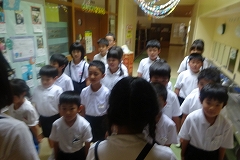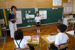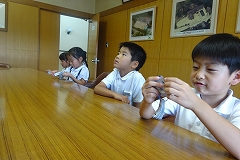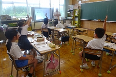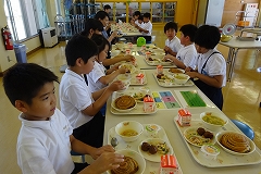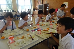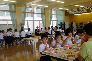 ↑給食は七夕メニューで,冷やし中華や星形のハンバーグ,流れ星ゼリー等季節感たっぷりでした.4年生で丹精込めて作った胡瓜を収穫し,いただきました.漬物にしていただきます.とってもみずみずしく,胡瓜の香りが夏らしかったです.給食の準備を待っている姿も立派です.高学年のリーダーがしっかり下級生に声をかけていました.