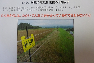 ↓ 山北の区長さんがイノシシ対策のため電気柵を設置したので子ども達も気を付けてほしいとお知らせを持っていらっしゃいました.子供たちには決して近寄らないように指導しました.ご家庭でもお話しください.