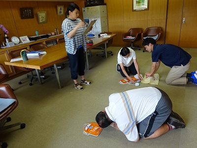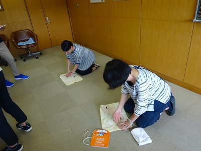 今日は,長めにとった昼休みを利用して,先生方の研修会が行われました.テーマは,「救命救急講習」です.保護者の皆様を対象に6月4日(月)の授業参観後にも,消防署の方を講師に実施させていただきましたが,職員も練習用のAEDを用いて,傷病者の発見から救急隊員に引き継ぐまでを想定して実技練習をしました.