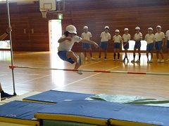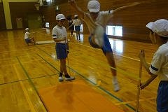 ↓ 5,6年体育 走り高跳びのフォームのめあてを各自考え,班のメンバーに伝えて,できているかアドバイスをしてもらいました.動画でも撮影し,班のみんなで確かめました.「足が伸びていていいね」「足が胸に引き寄せられているよ」「手を広げていてバランスがとれているね.」見てほしい視点に沿ったアドバイスもだんだん上手になってきました.
