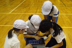 ↑ 5,6年生高跳び練習です.フォームを映像にとって確認して自分の課題について改善しています.