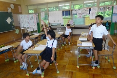 ↑学活 3,4年生 チームワークを高め親睦を深める目的で,学習クイズに取り組みました.席替えをして新しいメンバーで盛り上がりました.