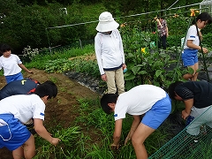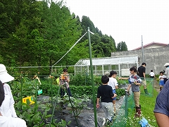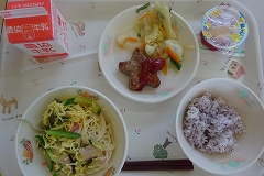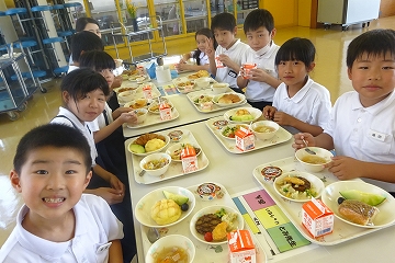 ↓ 2年生,畑で野菜の収穫です.収穫したきゅうりとなすは,調理室で料理をしていただき,今日の給食でみんなでいただきました.ポテトサラダのきゅうりとみそ汁のなすが学校園で収穫した野菜です.学校に調理場があるおかげですが,もうすぐ調理場ともお別れとなり,さびしくなります.今日の給食は,6年生のリクエスト給食で,リクエストのメニューは「わかめご飯」でした.ちょっぴり塩味で食欲がわき,普段摂りにくい無機質の栄養素もばっちりでした.