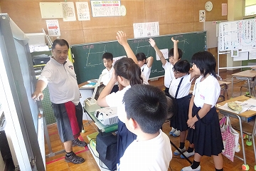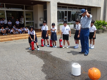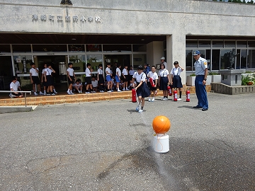 ↓シェイクアウトいしかわ 10:50 地震発生による訓練及びそれに伴い給食室からの火災を想定して訓練を実施しました.シェイクアウト(災害を振り払う)の安全行動「しゃがむ」「隠れる」「じっとする」はしっかり行動できました.津幡町消防署から講師をお招きし,この訓練による講評をいただきました.その後,いざというときに備えて行動できるよう,水消火器での消火訓練を実施しました.消火器は3つの動作①栓を抜く,②ホースを火に向ける,③レバーを強く握るです.5mくらい離れたところから少しずつ火に近づいて消火します.4年生以上が体験しました.