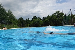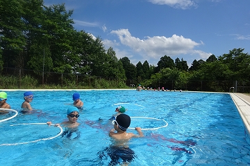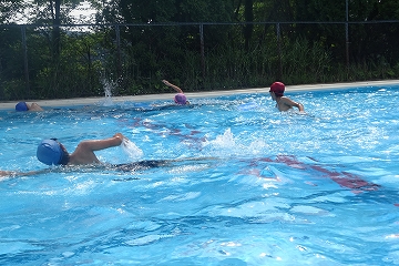 ↓ 5,6年生 水泳学習 クロールでは,腕をしっかり伸ばしてゆっくりとのびのびと動く練習をしました.とても暑いのでプールの学習は楽しいです.
