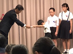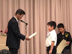 ↓ 体育の日の10月7日,夏休みにがんばった図工,書写作品の中から選ばれた優秀な作品の表彰式がシグナスで行われました。本校からは3名の児童が栄誉ある賞に表彰されました。5年生は素晴らしく津幡町長賞に,1年生はみごと銀賞,4年生は堂々たる銅賞に選ばれました。授賞式では,津幡町長賞に選ばれた5年児童の感想発表がステージの上で行われましたが,堂々と,はっきりした大きな声で,内容も素晴らしかったです。作品展は昨日までシグナスで行われていました。受賞おめでとうございます。