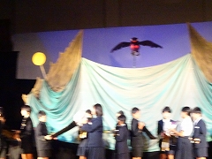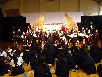 ↓ 文化庁の人形劇団の巡回公演が笠野小学校で行われました.目の前での公演は迫力がものすごく,感動が会場中に湧きおこりました.「人形」なのですが,劇団の方々の手にかかるとまるで生命が吹き込まれたかのように生き生きと動き出すのです.遠近感,高低感,スピード感が巧みな技で演出され,本当に驚きました.あっという間に人形劇の世界に引き込まれました.心豊かな時間を過ごさせていただきました.人形劇団京芸の皆さま,はるばる京都からご来校いただき本当にありがとうございました.子供たちの心には感動となってずっと残っていくことでしょう.