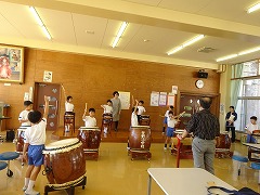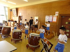 本日から地域の先生をお招きして、低学年が太鼓練習を開始しました。11月10日(土)に披露する全校児童での太鼓発表会のために、1,2年生は一足早く練習を始めました。今日は、太鼓の先生からでんでこ太鼓にまつわる話をお聞きし、そのあと、バチの持ち方、太鼓の打ち方、姿勢、足の位置など基本的な動きを教わりました。「好きこそものの上手なれ」とても意欲的で、どんどん上達することでしょう。