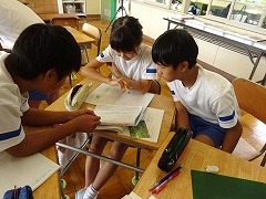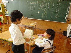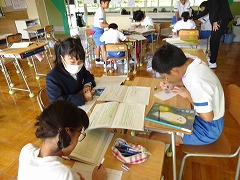 ↓ 週末読書 たくさんの児童が図書館で本を借りました。週末読書の秋を楽しんでください。国語の授業では、並行読書を進めています。例えば、4年の「ごんぎつね」では、登場人物の行動や気持ちの変化をとらえ、考えたことや感じたことを話し合う学習です。授業と並行して、ほかの物語で同じように読み比べていくことで登場人物の気持ちの変化を読む力がついていきます。