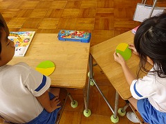 ↓ 2年生の道徳です。ごまかそうとする友達がいたとき、どうしたらよいのでしょう。みんなで考えました。心情円盤を使って、はっきり言う心を緑色、どうしよう、言えないかもしれないという心を黄色で表しました。怖い人や上級生の強い人だったら言えないな、でも言わなかったら、押し付けられた子が悲しむ、正しいことを言わなかったらずっと後悔して心に残ってしまう、その人のためにならない等、一生懸命考えました。話し合っているうちに、どんどん考えが変わり、やっぱりなんとかしてやめさせなければという気持ちが強くなっていきました。