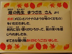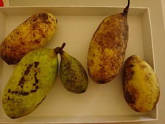 ↓ 地域の方に珍しい木の実をいただきました。ポポというものでバナナとメロンをミックスしたような味だそうです。20年ほど前に種をまき、大きくなって実ったそうです。ありがとうございました。