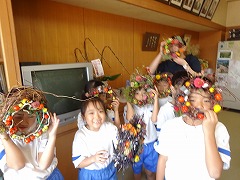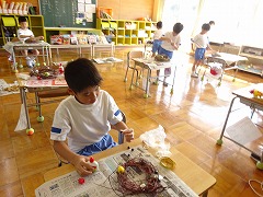 ↓ 1年生が育てたあさがおのツルでリースを作り、畑で育てた野菜や草花を乾燥させてリースに飾りました。色どりだけではなく、バーブの香りも楽しめます。育てて観察を楽しみ、リースを作って生活を楽しみました。出来上がったリースを校長室に見せに来てくれました。部屋中にハーブの良い香りが漂い、うっとり~いい気持ちです。