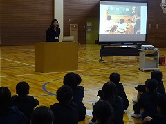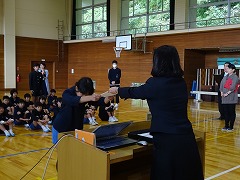 ↓ 私からは、笠野小学校で普段できている見通しを持って行動することや、挨拶をすること、全力を出すことが、津幡町小学校体育大会でも6年生がしっかりとできて、本物の力であったことを伝えました。また、「分け隔てのない心」と「誰もが持っている幸せになる権利、人権」についてお話しました。2年生の道徳で話し合っていた、「挨拶は人を大切にすること」ということが心に響いたこと、いしかわっ子駅伝の練習では、分け隔てなくみんなで一人一人を応援する姿が本当に素敵であることも話しました。