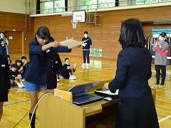 ↓ 皆様、学校にご来校いただきありがとうございました。今日から11月、霜月。朝晩冷え込みますが、今日は小春日和。穏やかな日となりました。全校集会では、芸術の秋(河北郡市小学校書写作品展、読書感想文コンクール)、スポーツの秋(校内マラソン大会)において特に優れた作品、優れた記録を残した皆さんを表彰しました。