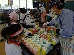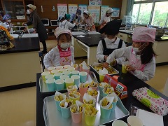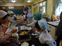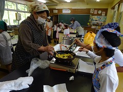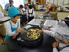 ↓1,2年生 「わくわくパーティーの準備」畑の先生や保育園さん、保護者の皆さんをお招きしてわくわくパーティーを開きます。その準備に収穫したサツマイモでおいしい料理を作りました。メニューは、津幡町の食生活生活改善員さんのご指導による、子供に人気のサツマイモスティックです。学校中にあまい香りが漂いました。
