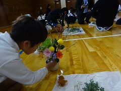 ↓ 自然ふれあいタイム 農林水産省のイノベーション事業で、子供たちが石川県産の花に親しみ、花や植物により潤いのある生活を営む心を育てる「花育」活動を実施しました。先生のご指導をいただき、寒桜、ガーベラ、ピンポン菊、ユーカリなどを思い思いにあしらって楽しみました。可憐な生花を手に取りはさみで切ってアレンジしていく本物体験で、みずみずしさがただよってきました。こんなに素晴らしい体験活動をありがとうございました。